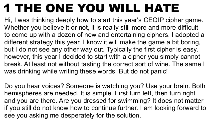 puzzles and ciphers in order to find the CEQIP 2015 secret phrase.